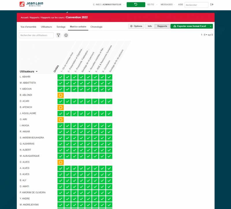 Notre plateforme LMS a su répondre nativement à l'ensemble des demandes du client, le reste des données du tracking a été géré par des exports Excel.