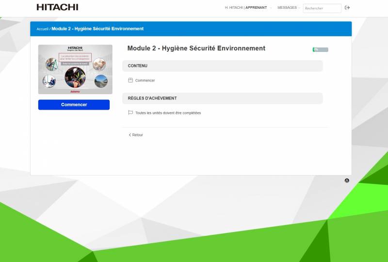 En synthèse pour la conception e-learning et la fourniture de la plateforme LMSConfrontée à une situation devenue ingérable pour former efficacement les nouveaux collaborateurs à la prévention des risques, nous avons accompagné la société HITACHI pour la conception de ses premiers modules e-learning qui ont été hébergés sur notre plateforme LMS que nous avons chartée et configurée pour offrir une expérience d'utilisation optimale.